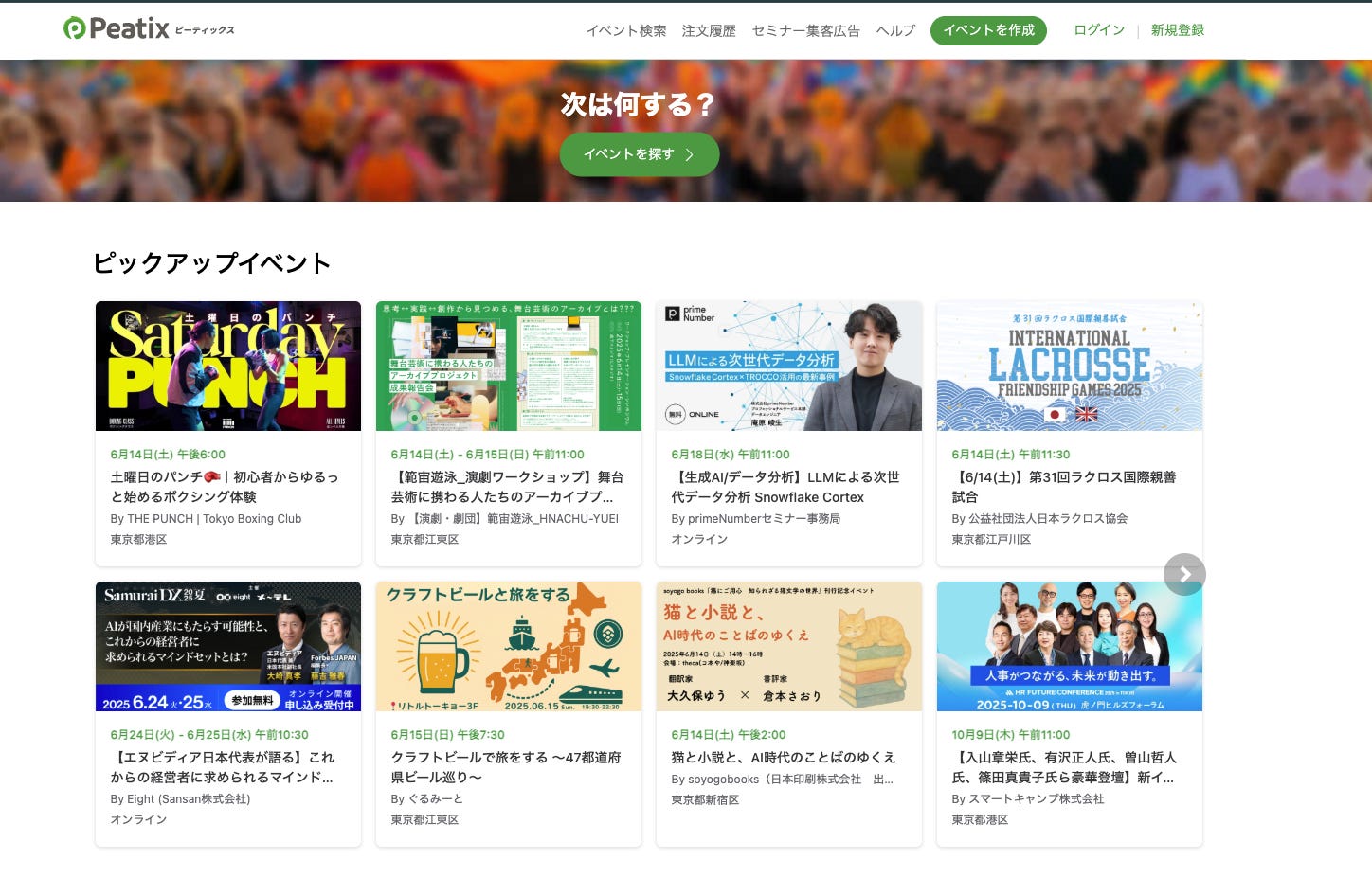 Peatix는 일반 사용자부터 기업, 문화 행사까지 폭넓은 분야의 이벤트를 아우르며, 일본 내에서 가장 많은 사용자 기반을 보유한 종합 이벤트 플랫폼입니다.